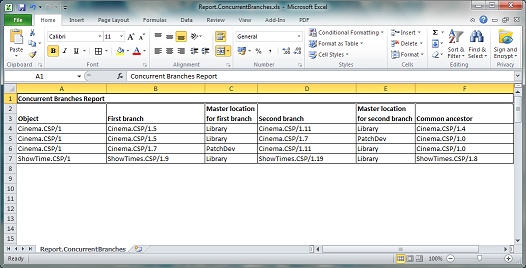 When an object has more than two branches, there will be multiple entries in the report detailing its concurrent branching history. This is because each row compares one branch with one of the other branches. The screenshot below shows details of two objects: Cinema.CSP/1, which has 3 branches, and ShowTimes.CSP/1, which has 2 branches.