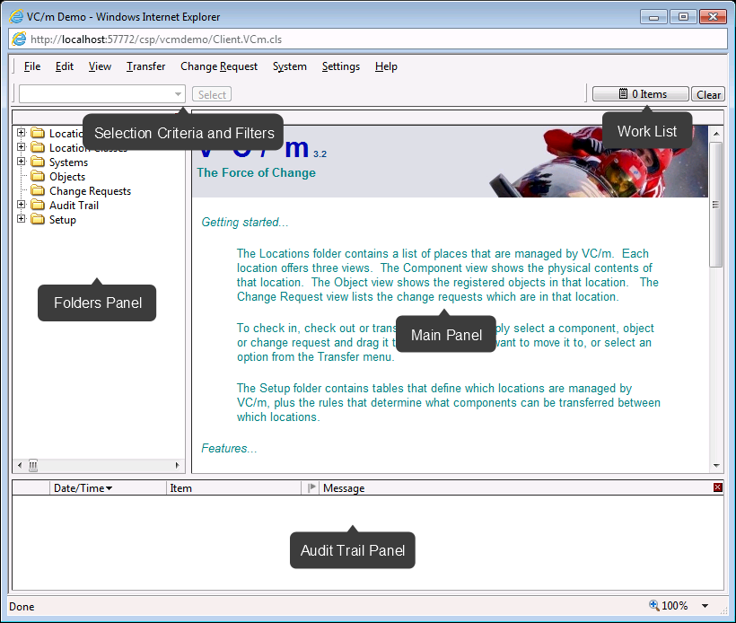 Below the menu and toolbars, the menu has three panels. The central section has a left and right-hand panel, similar to the Windows Explorer interface. The left-hand panel is the folders panel which displays a tree-menu for navigating between different areas of the interface, such as locations and setup options. The right-hand panel is the main panel which displays the contents of the item selected in the folders panel. The third panel, at the bottom, is the audit trail panel. This displays messages as the user interacts with VC/m. Most of these messages are also recorded in the audit trail.