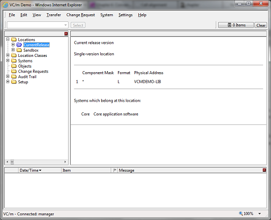 Each location folder can be expanded to show the next level of the tree. The next level typically has three folders (views): objects, change requests and components. Each of the views displays the contents of the location in a different way.