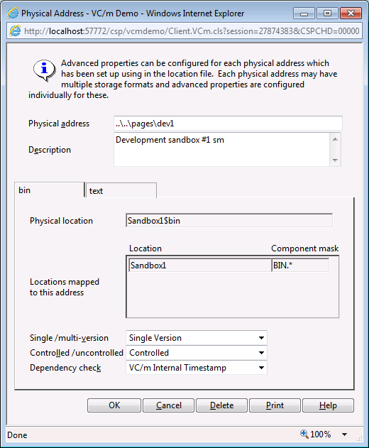 An uncontrolled physical location is one whose contents VC/m does not assume it has exclusive control of. Uncontrolled locations can be referenced within VC/m in exactly the same way as controlled locations. The difference is that VC/m does not perform any checks on the contents of an uncontrolled location before making a transfer to it. Deletions are not propagated to uncontrolled locations, and unregistered components are not protected from being overwritten in uncontrolled locations.