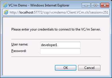 Unless integrated with another security infrastructure, when connecting to the VC/m browser interface the user is prompted for their User ID and password with this dialog: